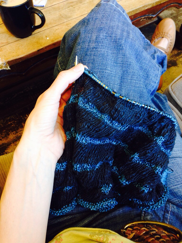 I had an interesting vaycay I was sick for half of it. A nightmare really but I’m better now and back at it. My White Caps Cowl keeps going and going. Can’t wait to be finished. My other projects are on hold. With many projects in the queue I hesitate to start something new without finishing at least one and this is going to be the one. I will get wear out of this I’m hoping. The silk and cotton isn’t too heavy.