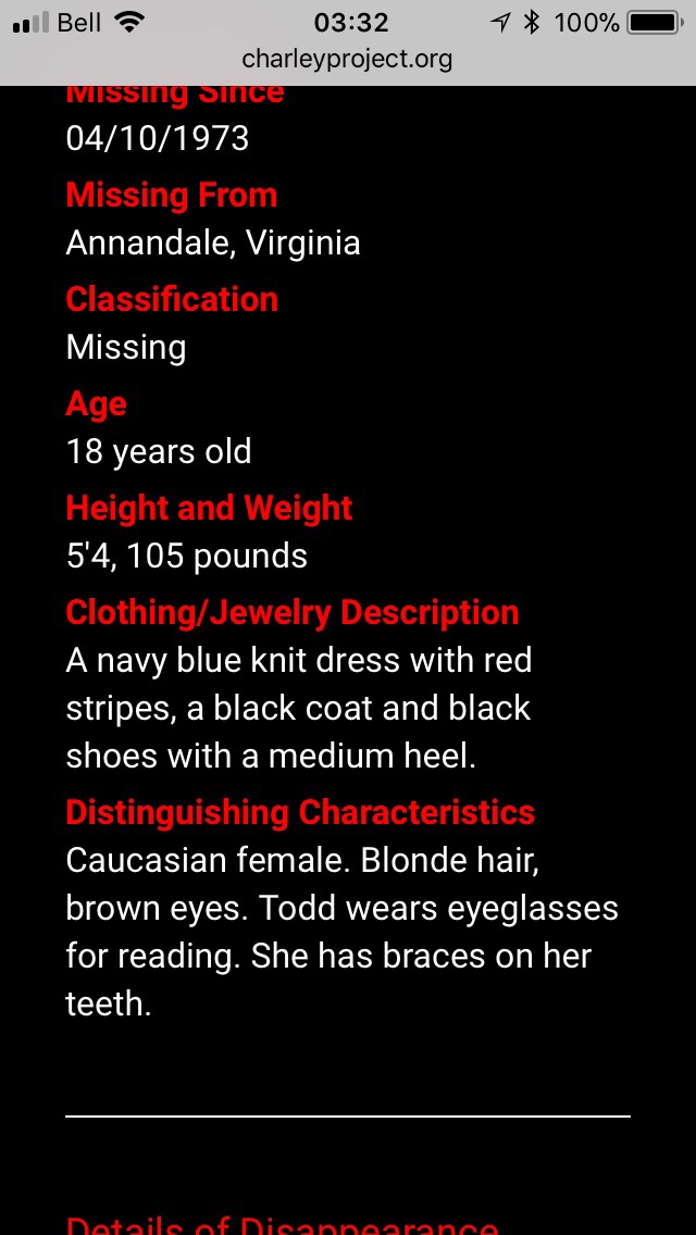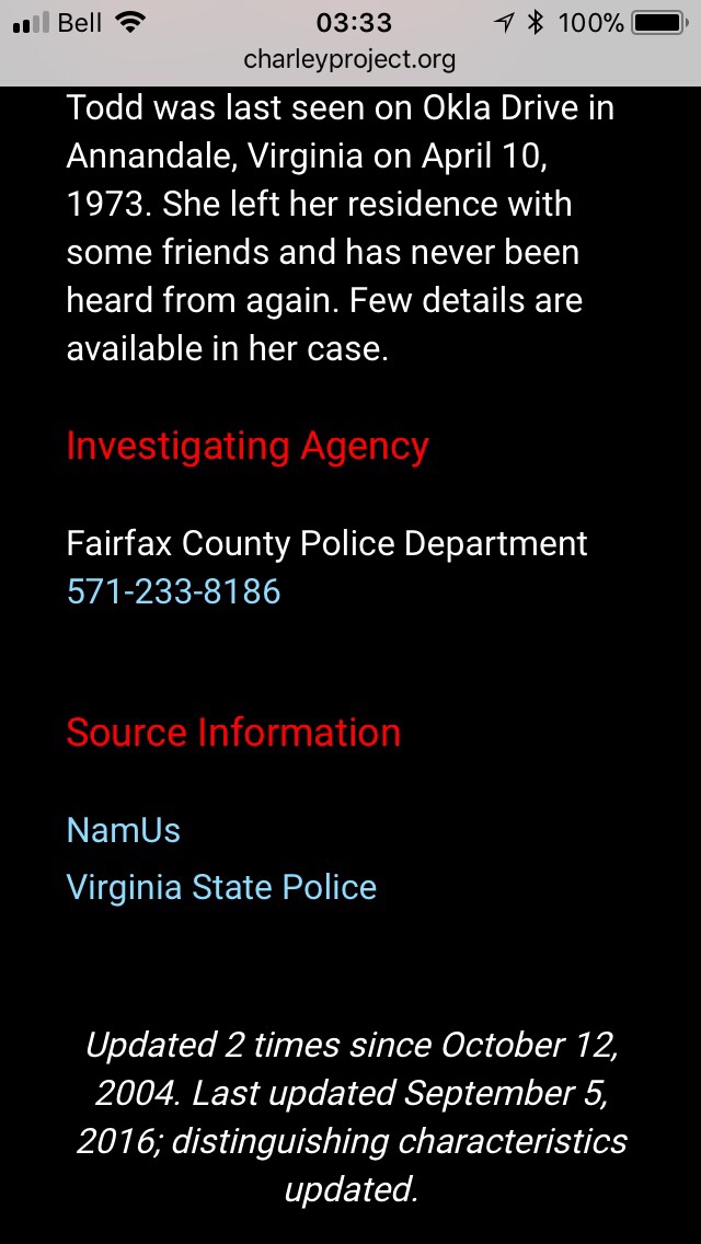 So one day I was on another missing persons site and a little face on a missing poster staring back that me connected with something inside of me. Compelling me to look further. She had a name Diane Lee Todd, 18 years old.