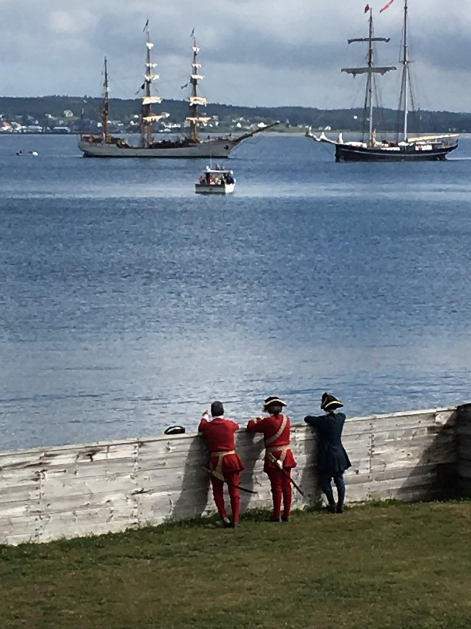 The Tall Ships are coming!!! The Bluenose was there when I drove in this AM. We had a chance to perch ourselves on top of Black Rock. Birds eye view. Lucky birds. 350 year old graffiti up here, a French solider carved "Louis" into the rock.