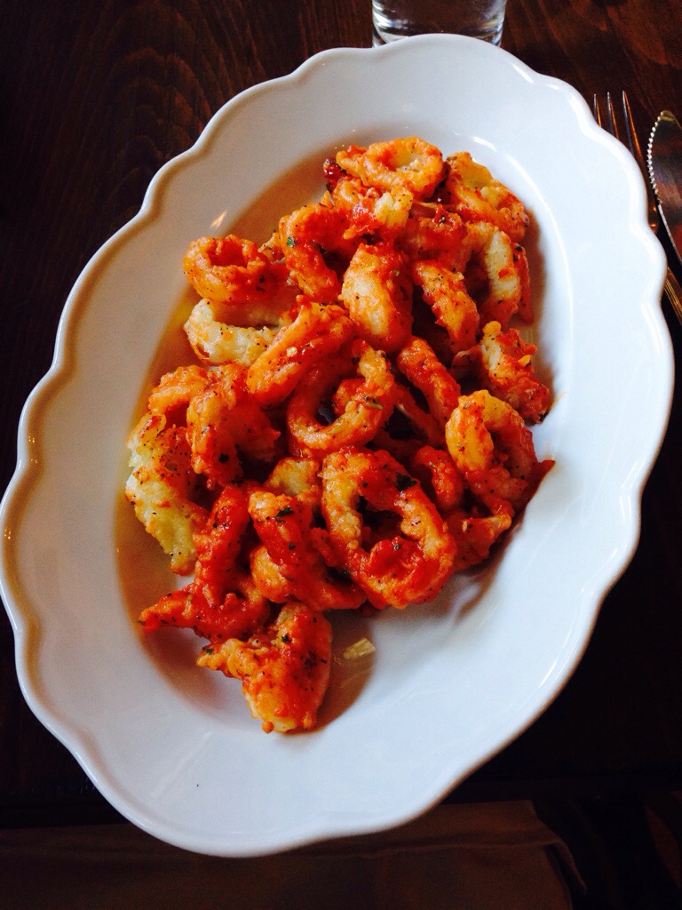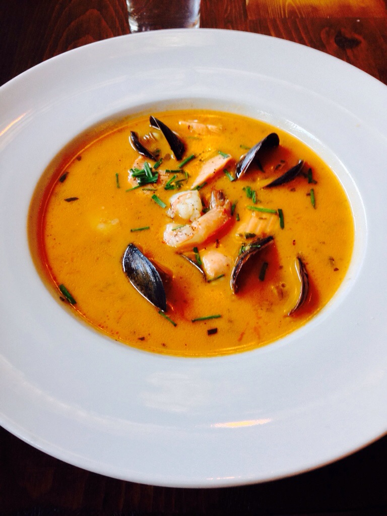 I’m out and about today, eating, wandering, knitting like a little lost soul. That’s what an impromptu day off is like. Usually I’m scheduled to the max. I’m liking it. Everyone on the street is happy. The sun is sending out it’s happy rays today. I ate at La Frasca (sorry D). I’ve been craving the calamari for months. The fish soup was delicious.