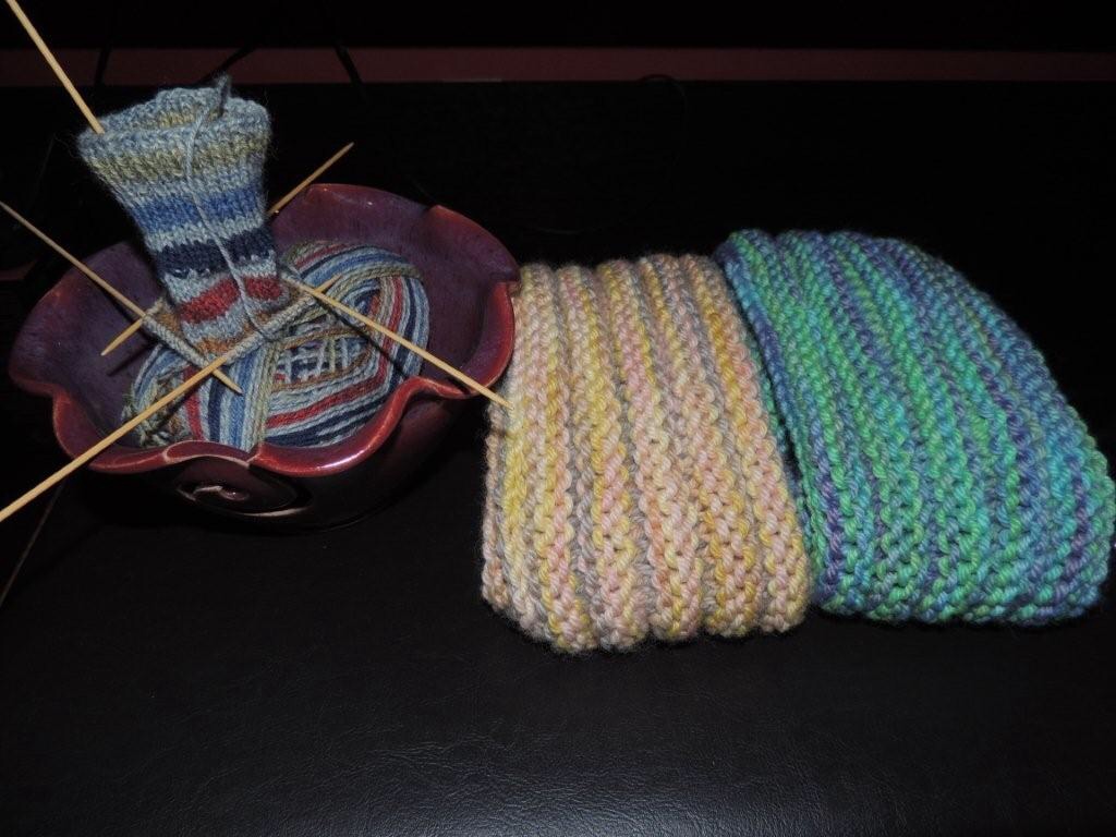 The cowls were knit with Fleece Artist’s Big Blue, 100% Blue Face Leicester wool. The socks are being knit with Kroy sock Yarn. I love the stripes.