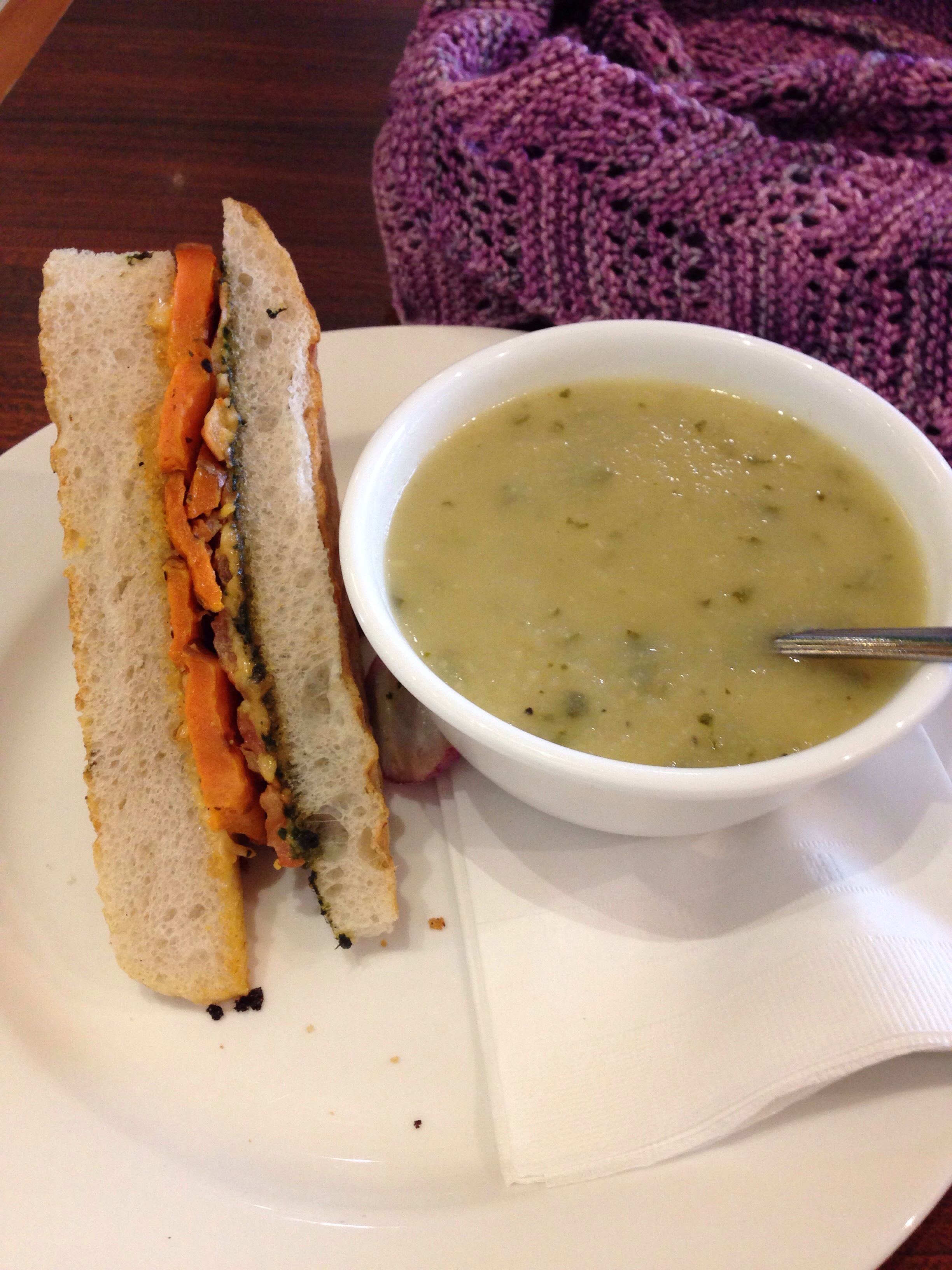 The Round House by Louise Erdrich Uncategorized I started reading this book, I’m only on page 15 and I’m hooked. It’s my “on-the-go” book. I’m out and about up day enjoying lunch at The Designer Cafe. Parsnip and spinach soup with avocado, sweet potato on Focaccia bread.