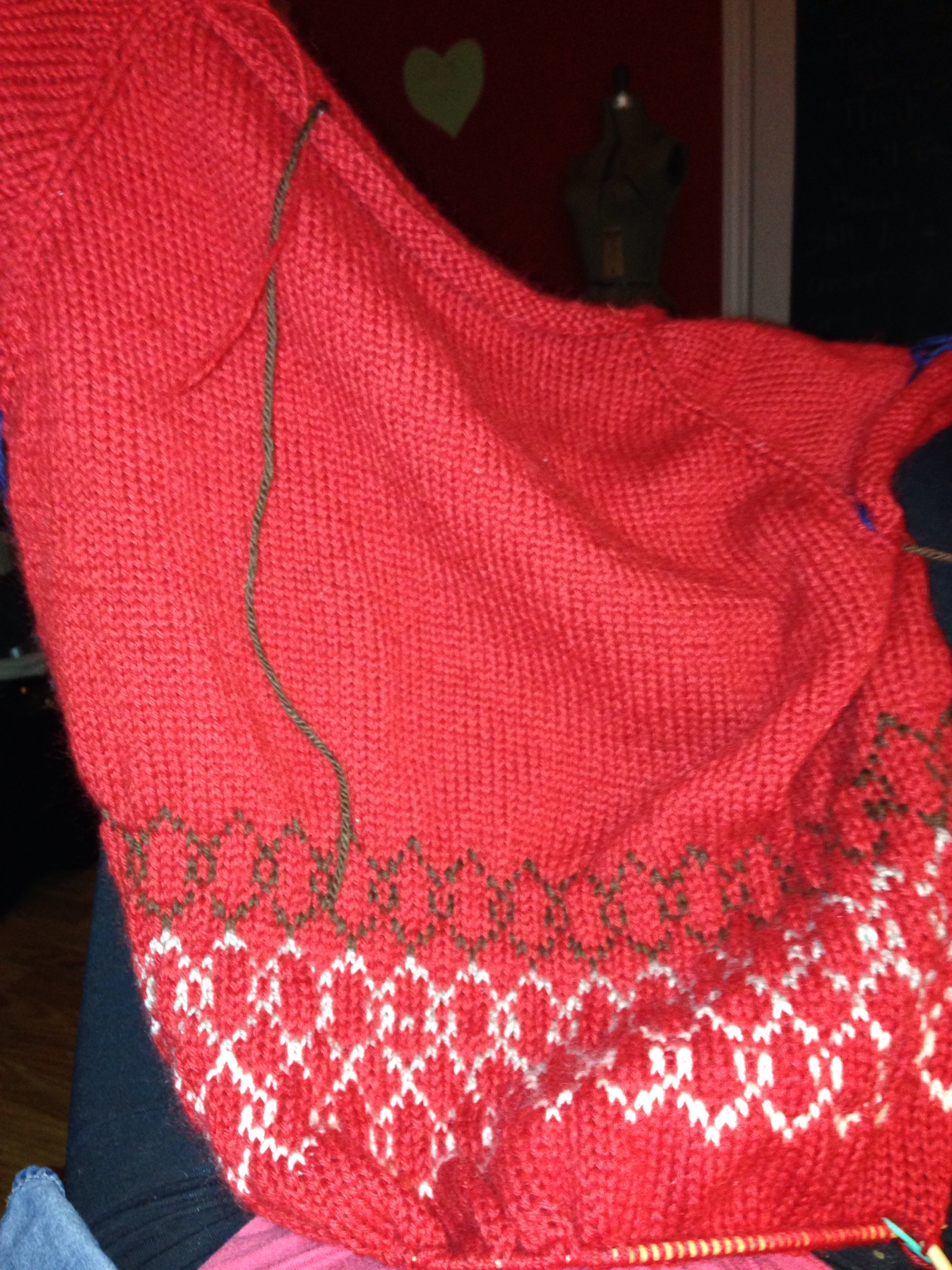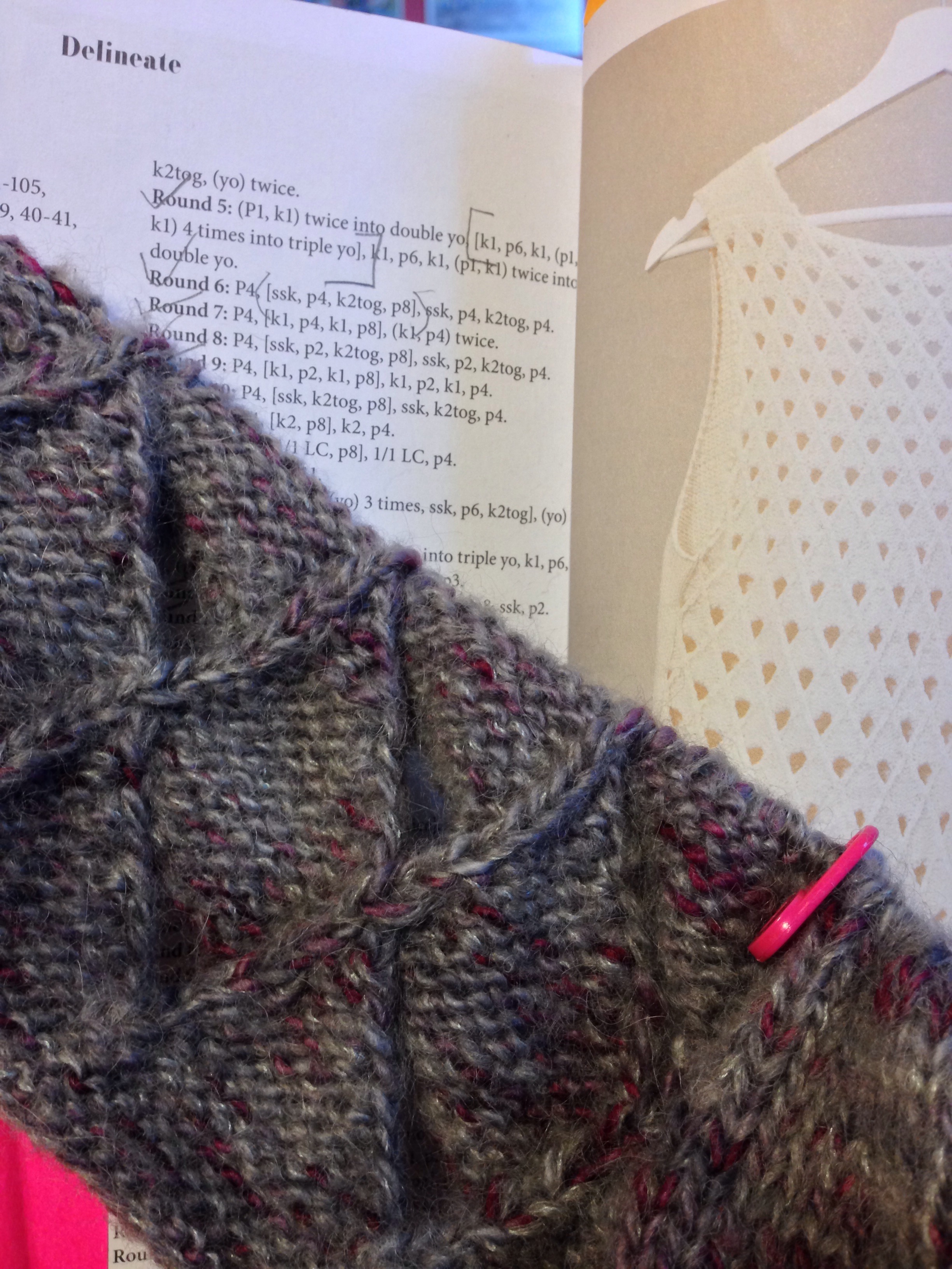 I’m sharing my latest project. The pattern is from the quarterly Pompom magazine. I’m knitting with Madeleine Tosh 1ply 100% merino and Berroco Andean Mist, baby suri alpaca and mulberry silk. I’m knitting with both strands held together. I wish I could share the softness. The pattern is really fun to knit, not complicated but results in a pretty open work pattern. The front of the piece is plain with a V neck and the back is open work. Can’t wait to wear it.