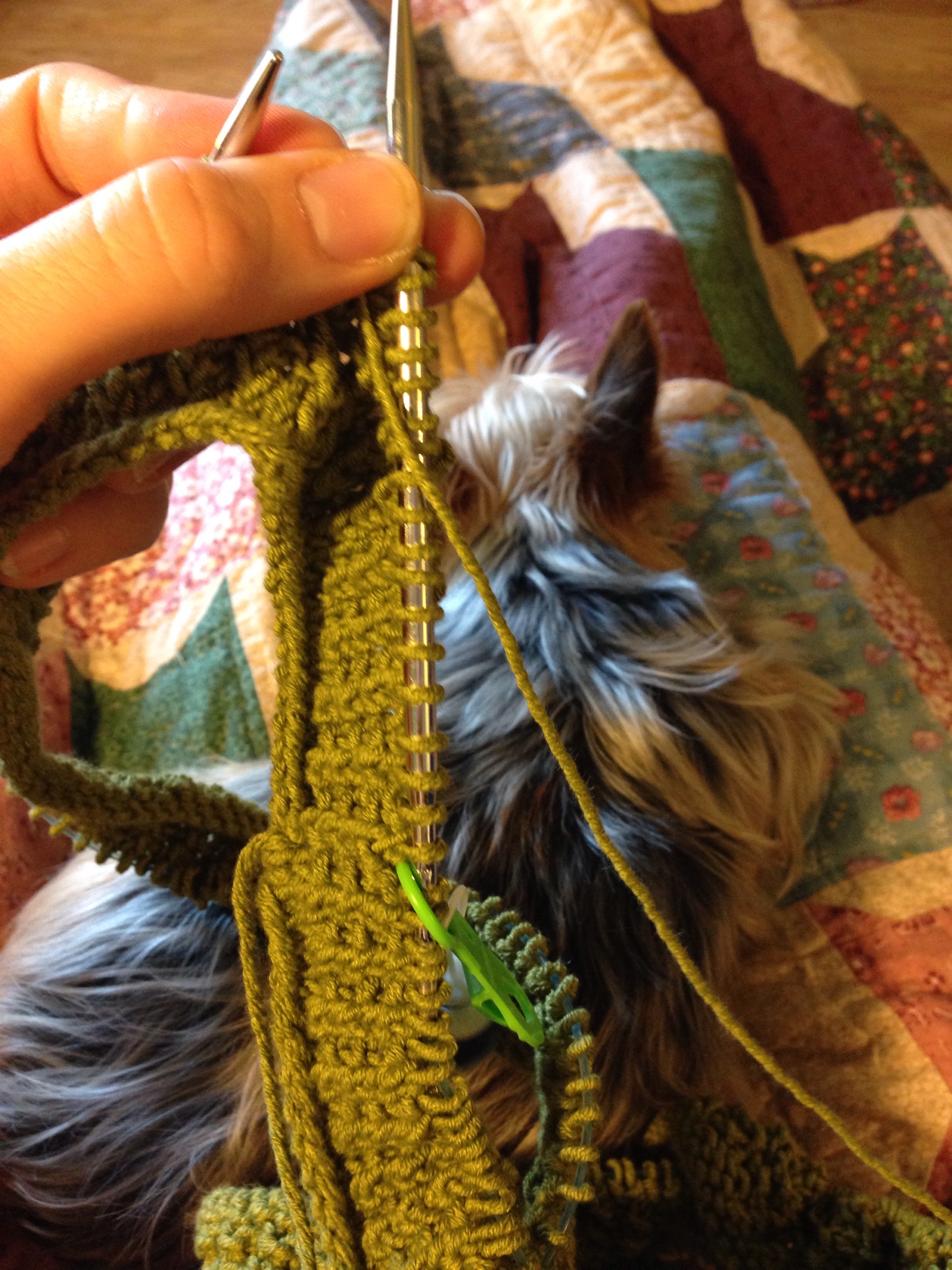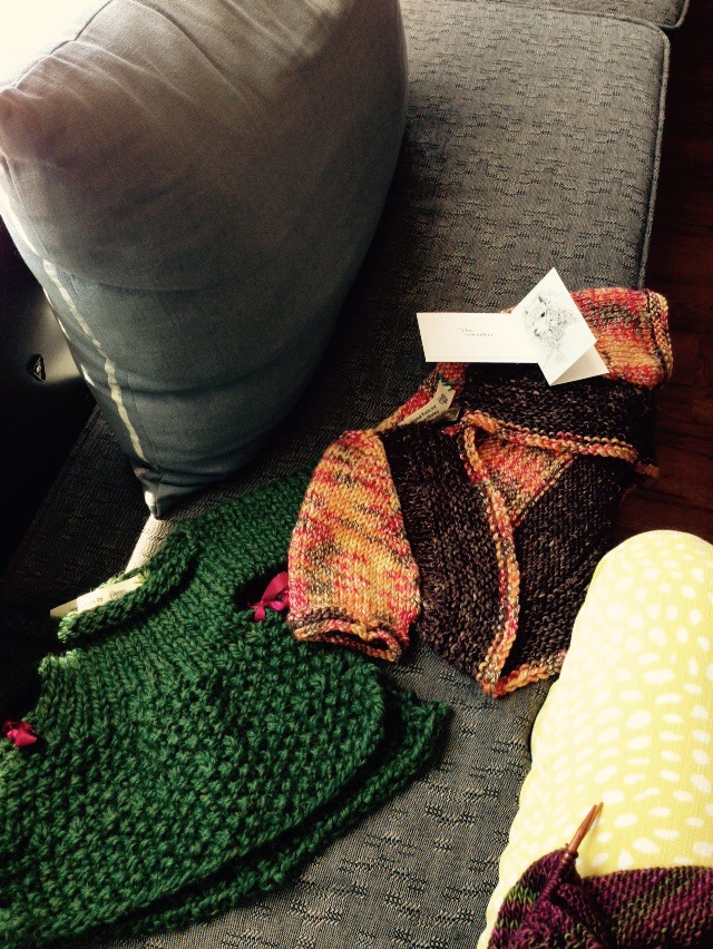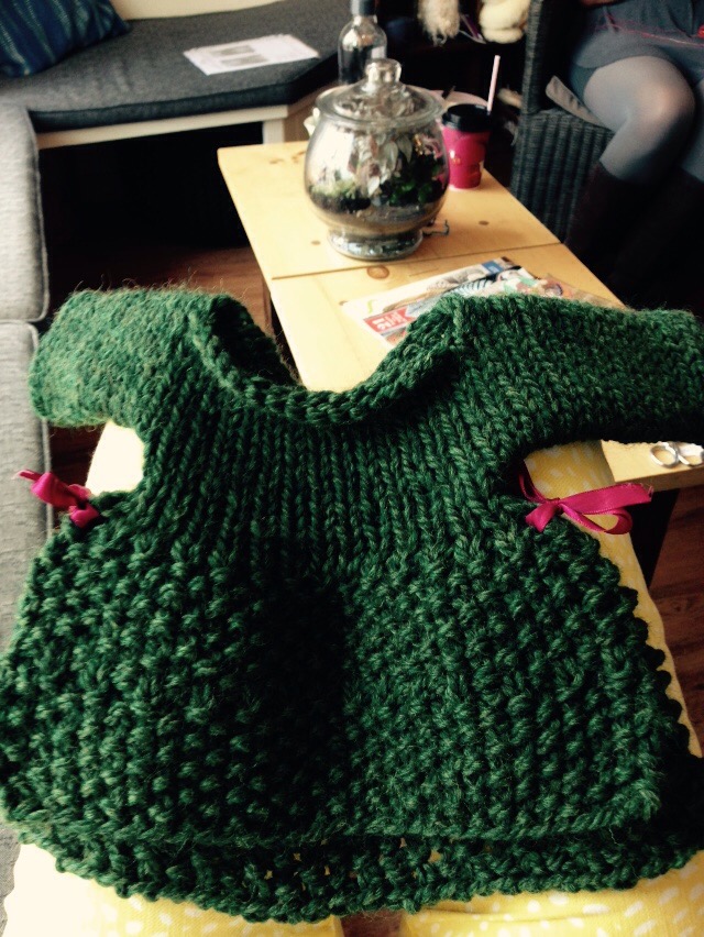 I’ve been busily practicing for a casual guitar recital today. Also, I whipped up this little green Bow Peep dress. My guitar teacher’s baby daughter Siobhan will be the recipient. A Thank-you for putting up with my classical guitar shenanigans. The little bolero I knit with a yarn called Folk Song, and a bit of Noro.